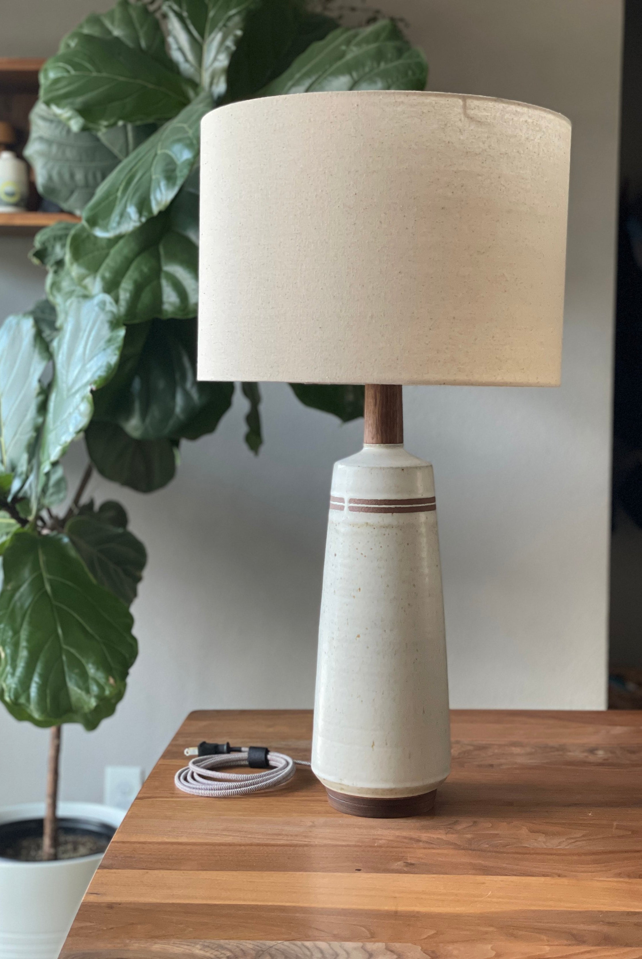 We utilize solid walnut, white oak, teak and rosewood to hand turn each neck and base of our lamps on the lathe.