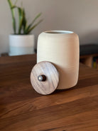 Stoneware and hand-turned solid wood.