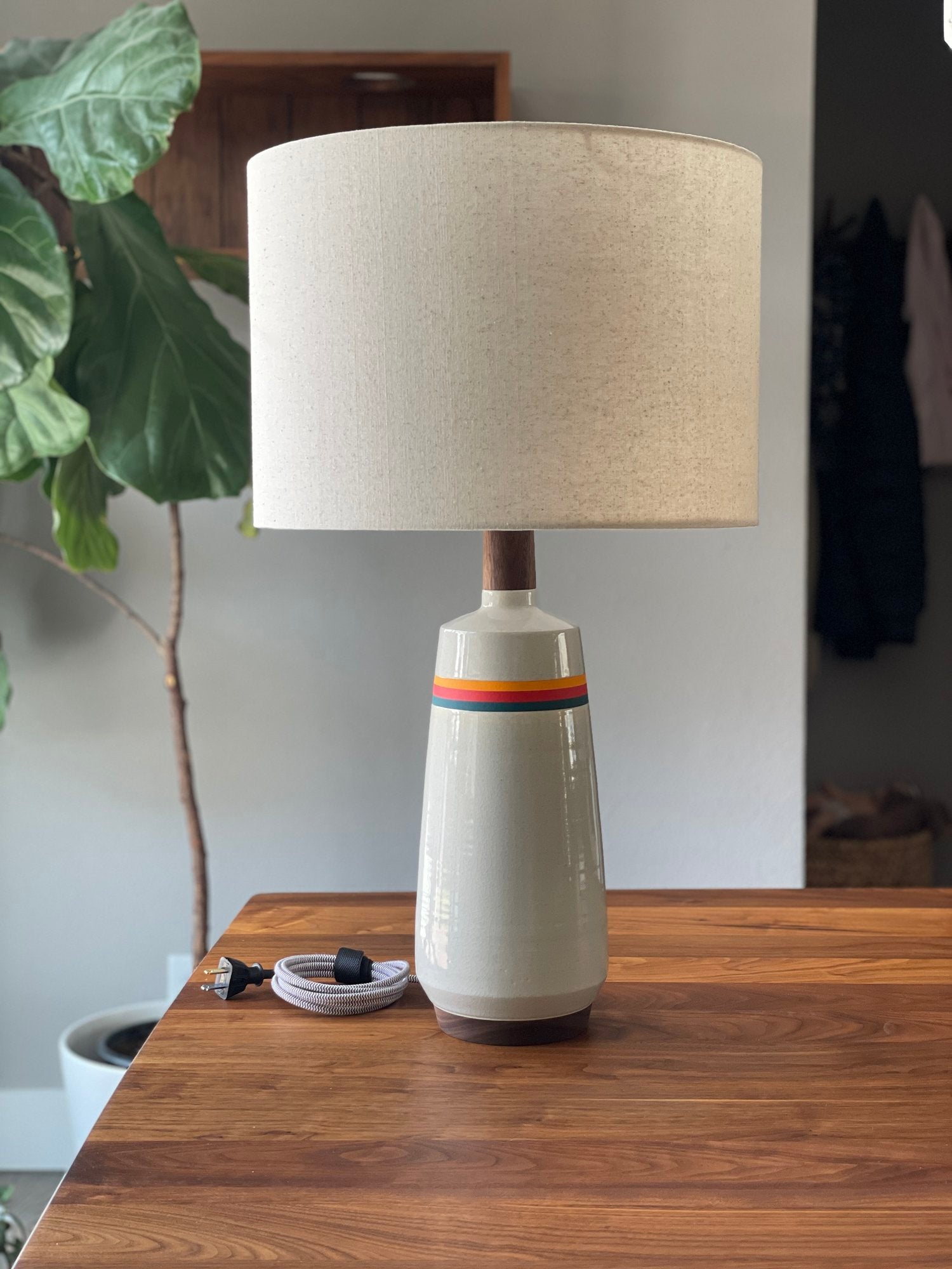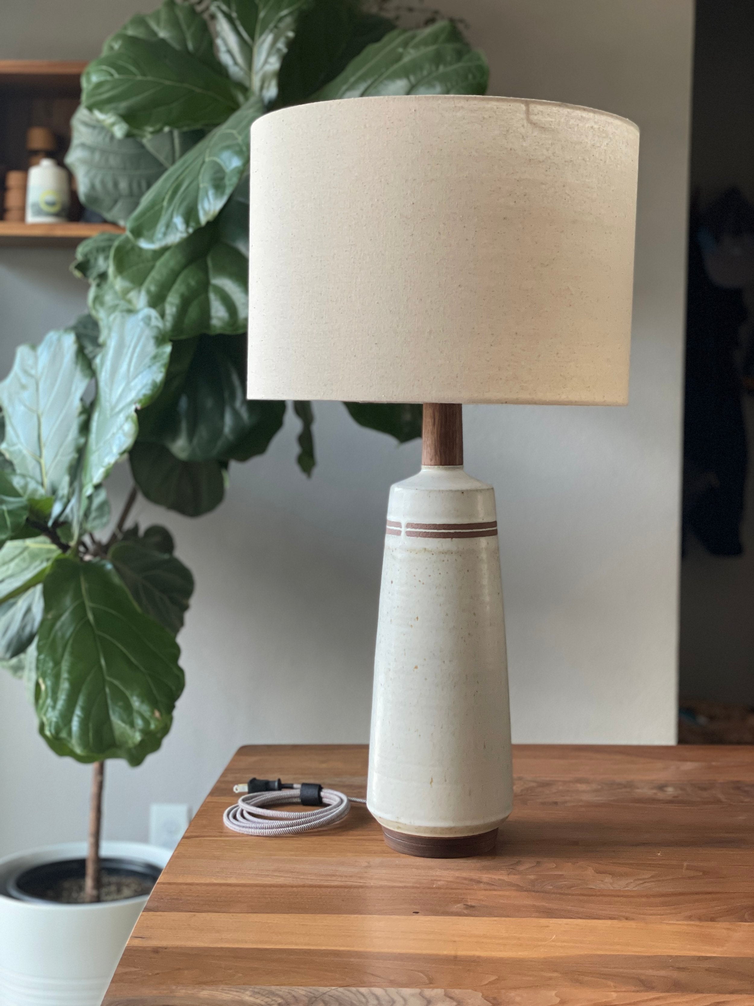 Tall and sculptural, this modern lamp is flexible and timeless in design. One of our favorite designs to throw on the wheel, and a classic mid century shape. This one feels like "the standard" to us, but that doesn't make it boring. Some of our very favorite glaze combinations lend so well to this form.