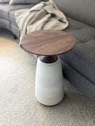 Created of hand turned solid wood tops, neck, and bases, then paired with hand-thrown ceramic base. These tables are show-stopping accents in the home.