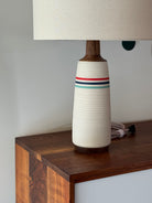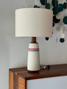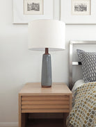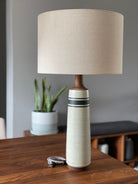Long and slender, this stunning modern table lamp brings life to your space. It's sophisticated silhouette and detailed walnut neck make it a true statement piece.