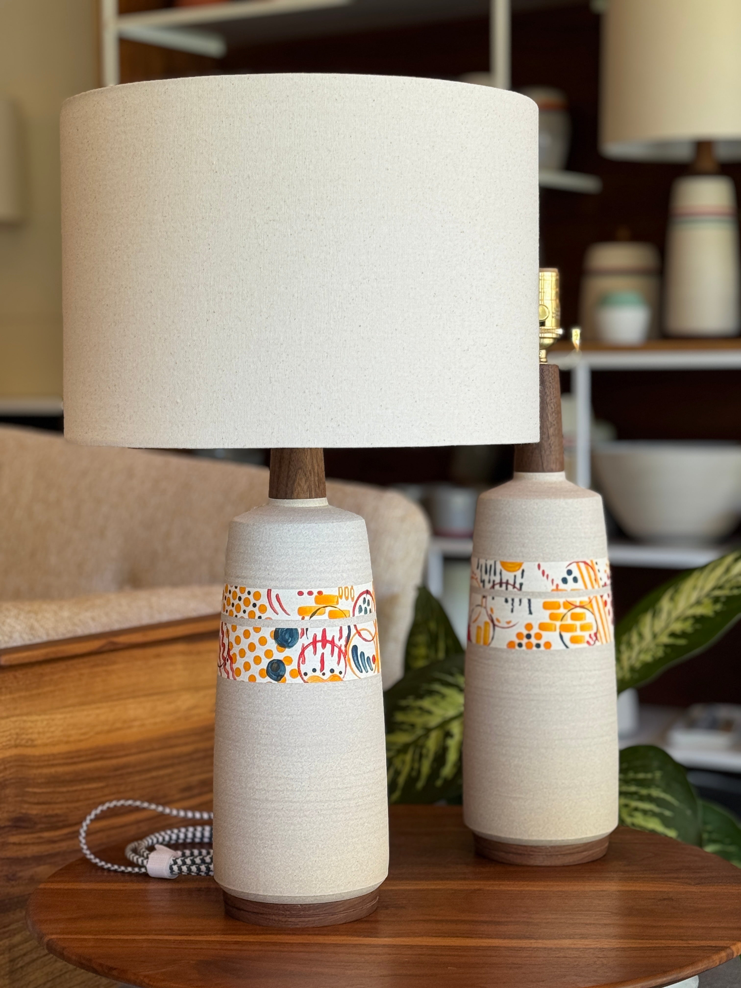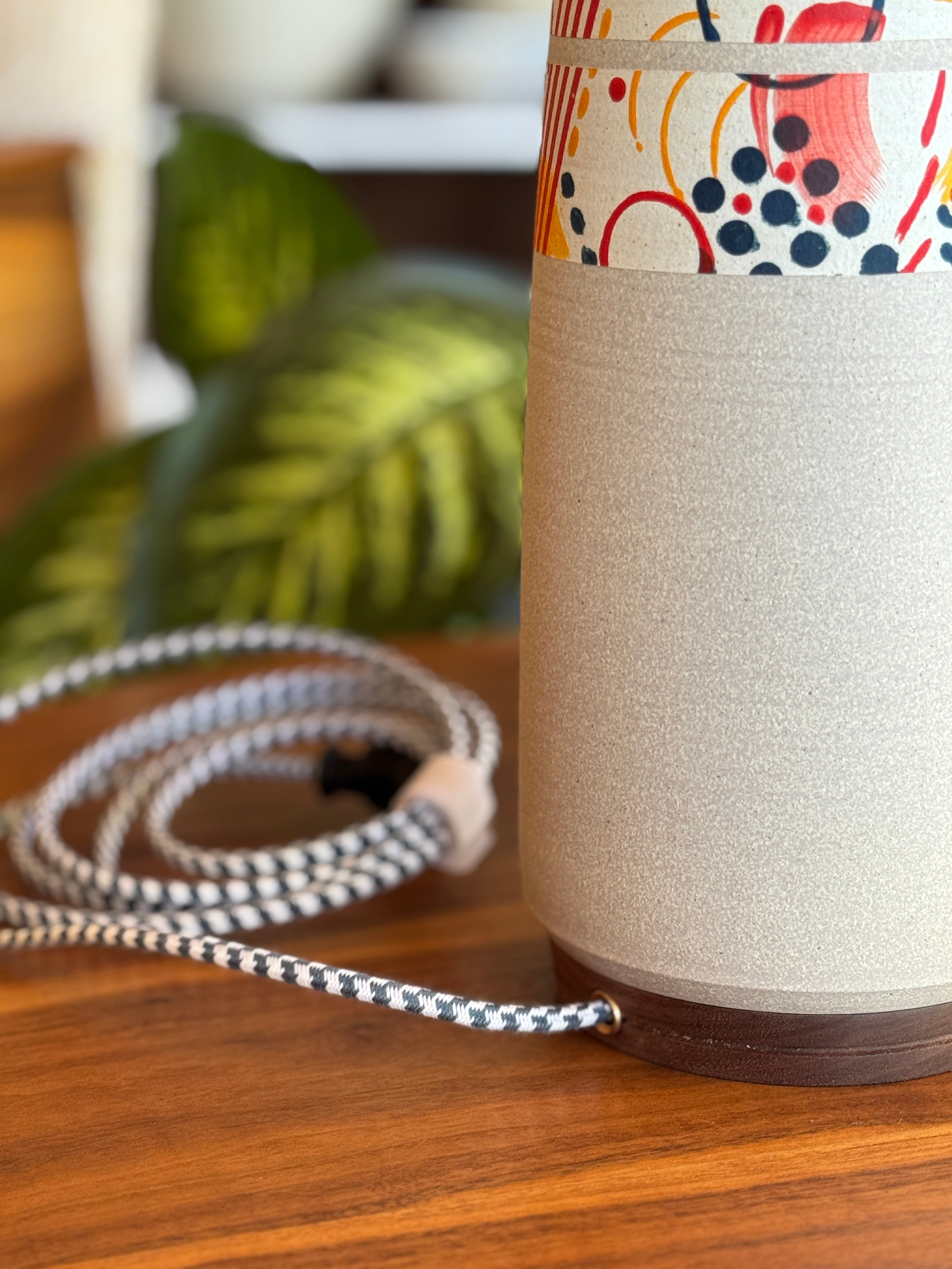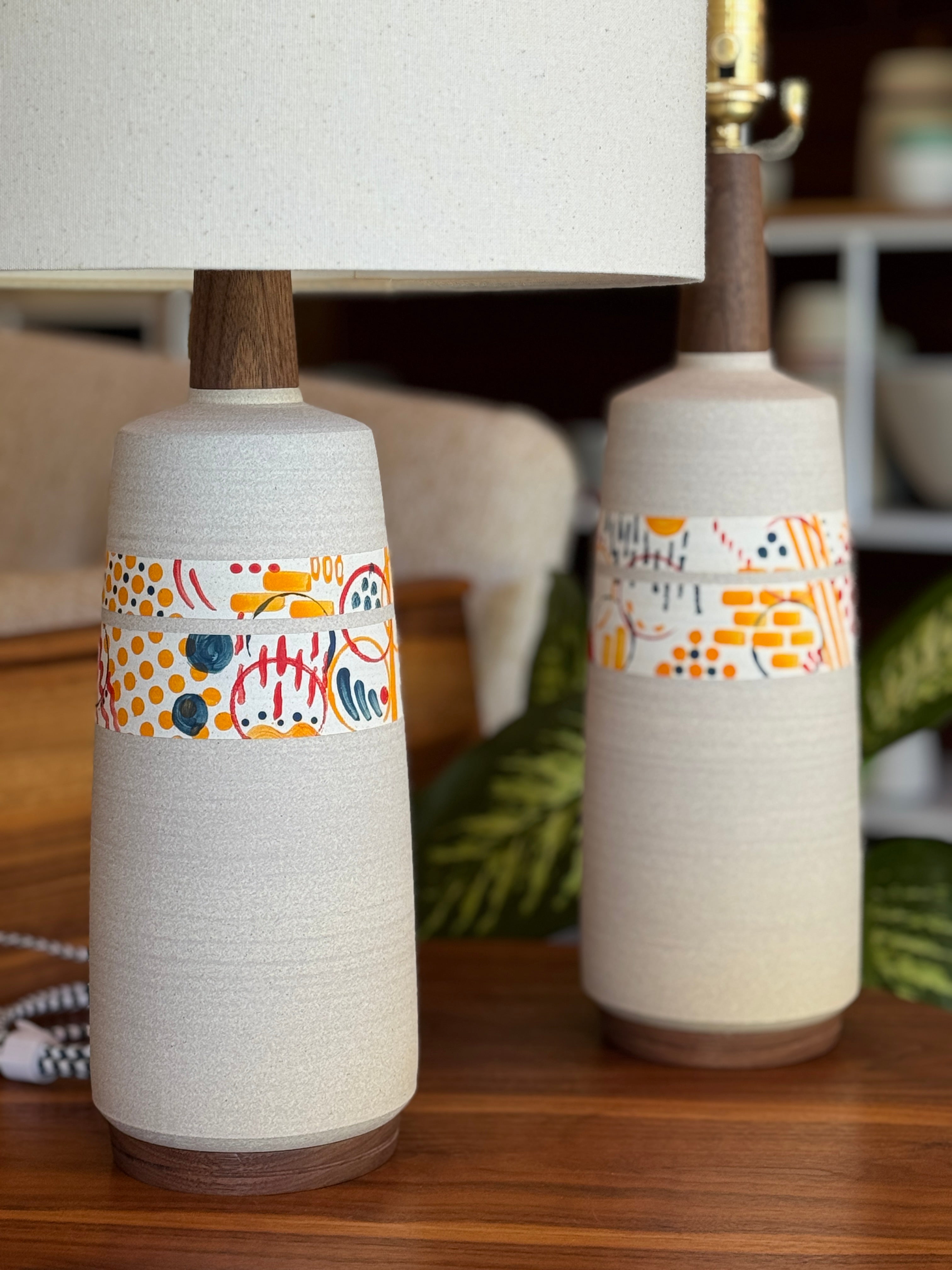 Sculptural and modern, this table lamp features long lines and a detailed walnut neck and base. A playful glaze design in our classic color scheme complements our walnut accents. Each piece is totally unique, given the nature of this glazing style.