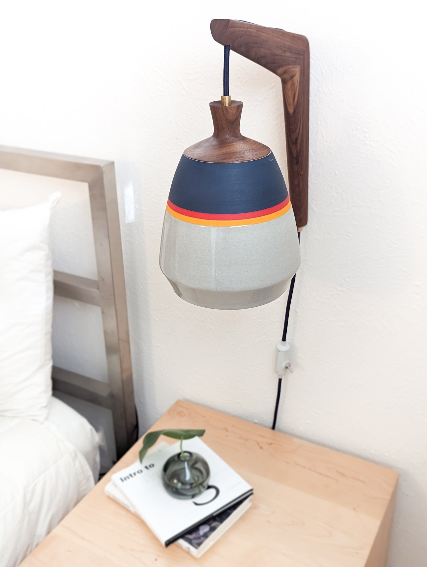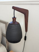 This wheel-thrown stoneware sconce is finished with a solid walnut, handmade mount. A fabric wrapped cord and inline on/off switch completes this sculptural fixture.